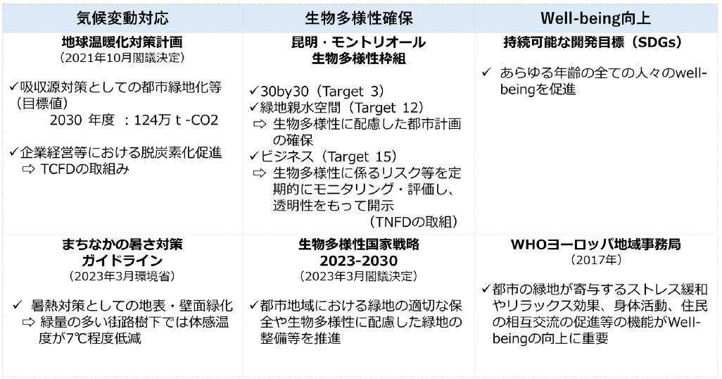 国土交通省は、近時、地球規模の課題である①気候変動対応(CO2の吸収、エネルギーの効率化、暑熱対策等)や②生物多様性の確保(生物の生息・生育環境の確保等)に加え、コロナ禍を契機とした人々のライフスタイルの変化を受けた③幸福度(well-being)の向上(健康の増進、良好な子育て環境等)の社会的要請に対応すべく、都市緑地の多様な機能の発揮及び都市におけるエネルギーの面的利用の推進を図る取組等を推進している※1。