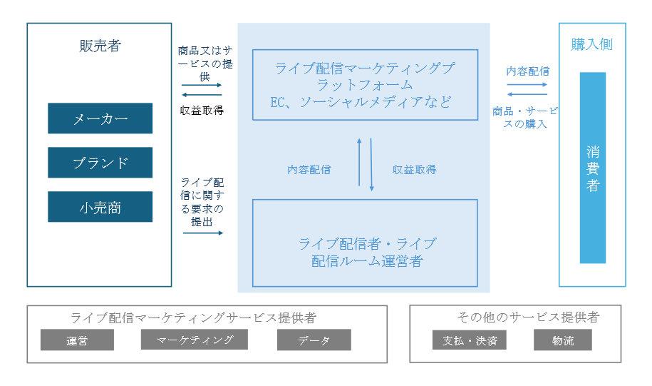 これらのライブ配信マーケティング関連主体及びその相互関係は、以下のとおりである。