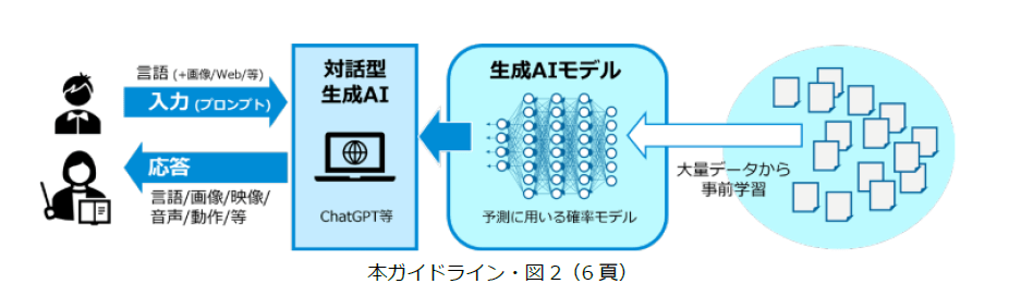 このように、本ガイドライン・本編は、項目1において、改訂前と同様、まずは生成AIに関する説明を行っています。なお、生成AIの概要については、本ガイドライン・図2として示された図が非常にわかりやすいものとなっています。
