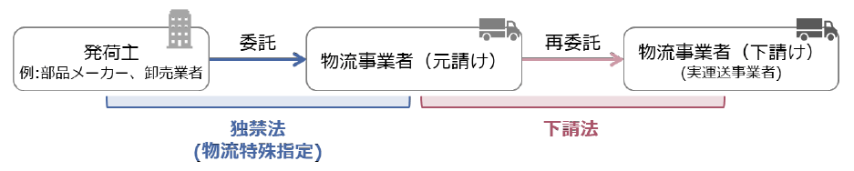 物品の運送又は保管を委託する取引については、現在、①荷主と物流事業者との間の取引に関しては、独占禁止法上の告示である「特定荷主が物品の運送又は保管を委託する場合の特定の不公正な取引方法」(以下「物流特殊指定」といいます。)を適用し、②物流事業者間の再委託取引に関しては、下請法を適用する、というすみ分けがなされています。もっとも、近年、物流特殊指定が規律する①の取引について、独占禁止法上の問題につながるおそれのある行為がみられた荷主の数が高止まりしていることが指摘されていました。