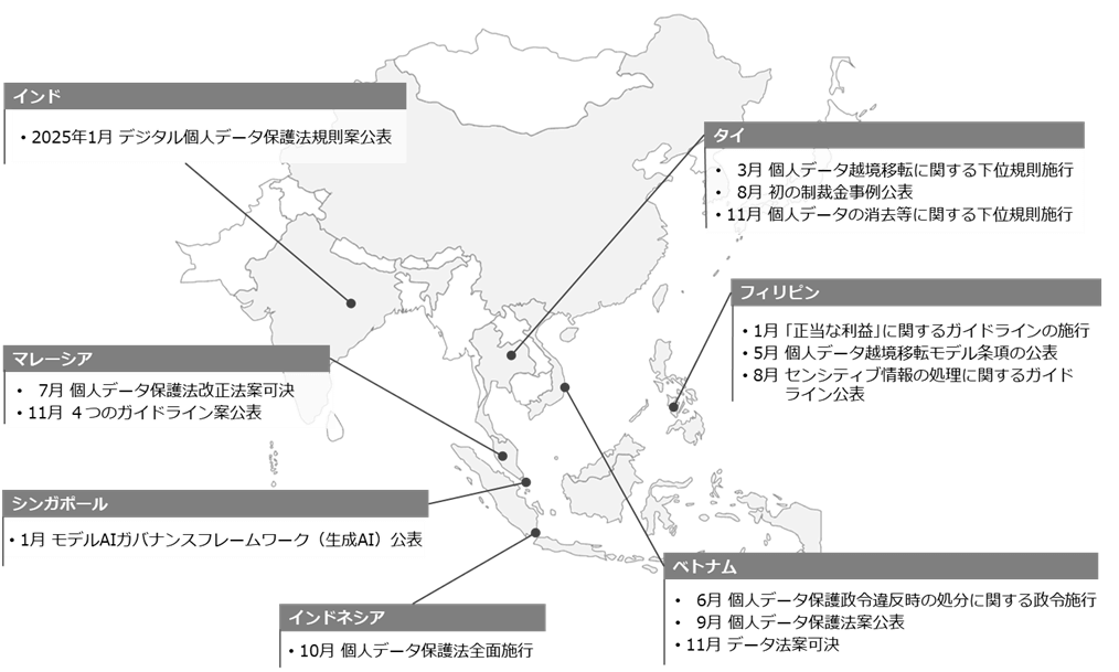 東南アジア主要国及びインドにおける昨年から現在までの個人情報保護・データプライバシーに関する動きは、主に以下のとおりです(年数の記載がないものは、2024年中の出来事を示しています。)。