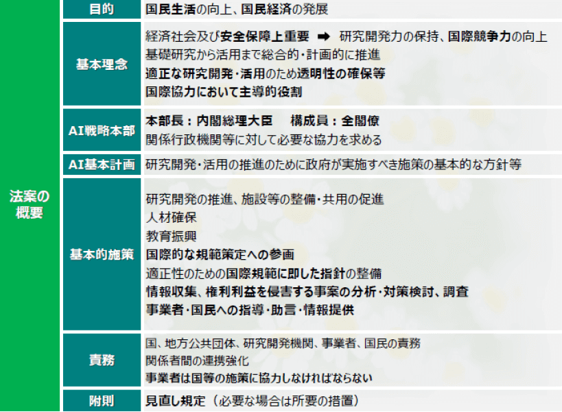 AI法案の概要は、国会に提出された概要資料において以下のようにまとめられています。
