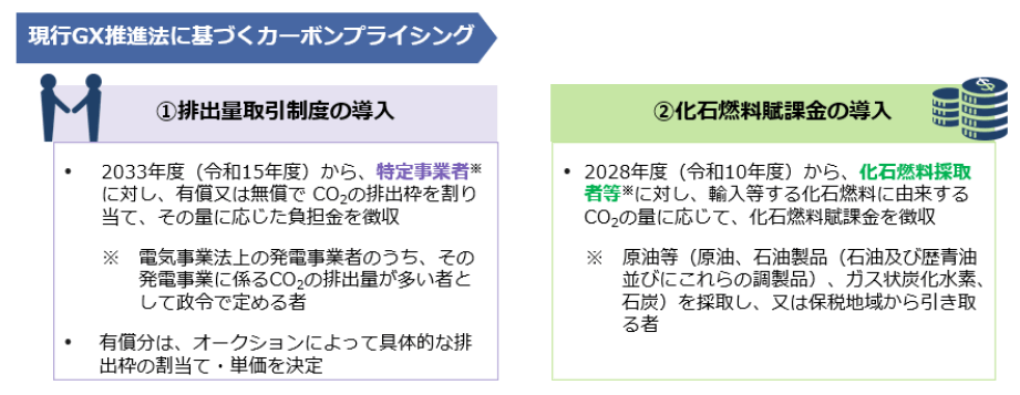 また、GX推進戦略は、「成長志向型カーボンプライシング構想」の中核であるカーボンプライシングの手法として排出量取引制度と炭素に対する賦課金制度を導入することも定め、既に、現行GX推進法には両制度の骨格が規律されています。その概要は下記の図のとおりです。