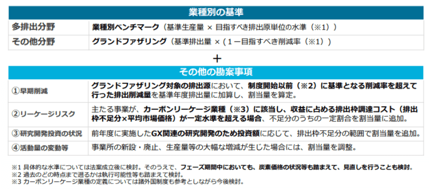 GXリーグには、2024年3月時点で700社超が参画し、日本の温室効果ガス排出量の5割以上を占める企業が制度に参加しているとされています。ただ、参加が自主的であるがゆえに業種ごとに参画割合に差があるのが実態とされ、また、プレッジ&レビューによる規律を前提として各企業が自ら設定する野心的な削減目標の達成に取り組む仕組みであるため、業種間のみならず、同一業種内においても、各社の削減目標の水準に差が生じるという難点が指摘されていました(内閣官房GX実行推進室「排出量取引制度の本格稼働に向けた検討の方向性」(GX実現に向けたカーボンプライシング専門ワーキンググループ第1回(2024年9月3日開催)資料3)9頁・11頁・17頁)。