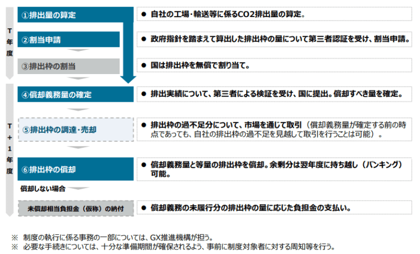 GX推進戦略は、排出量取引については、2023年度から試行的に開始したGXリーグにおける自主参加型の排出量取引制度※4の運⽤を通じて、知⾒やノウハウの蓄積、必要なデータ収集を⾏いながら、2026年度以降の本格稼働に向けた詳細設計の検討を進めるとしていました。本改正法案は、GX推進戦略のかかる方針を受け、2026年度以降の排出量取引制度の本格稼働に向けた基本的ルールを明らかにしています。