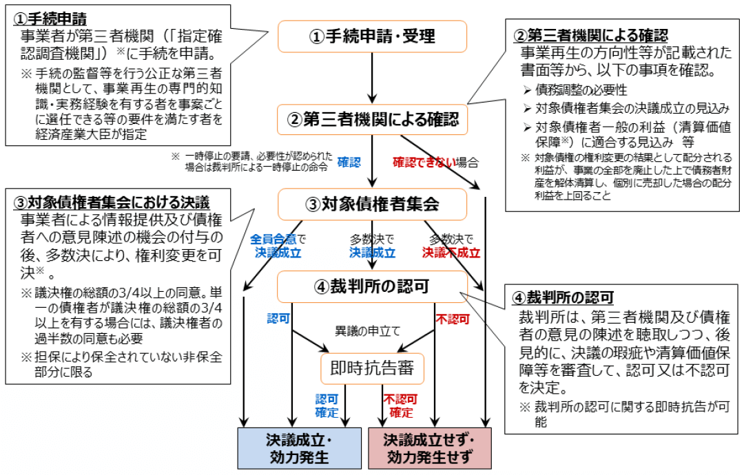 新制度の手続は、申請事業者が第三者機関に対し非保全債権の権利変更計画の概要(権利変更概要書)等を提出し、第三者機関が以下の要件の全てを充足することを確認することによって開始されます(3条1項)。