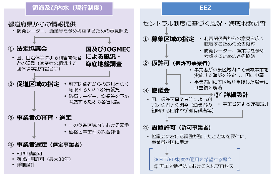 現行法の下での一般海域における制度では、促進区域の指定の段階で「漁業に支障を及ぼさないことが見込まれること」が求められる。これに対し、排他的経済水域における手続では、①募集区域の設定の時点では、海洋再エネ発電事業の実施により「漁業に明白な支障が及ぶとは認められないこと」が求められ、その後関係漁業者も含めた協議会において協議が実施された後、②設置許可に際しては、海洋再エネ発電事業の実施により「漁業に支障を及ぼすおそれがないこと」が求められる。