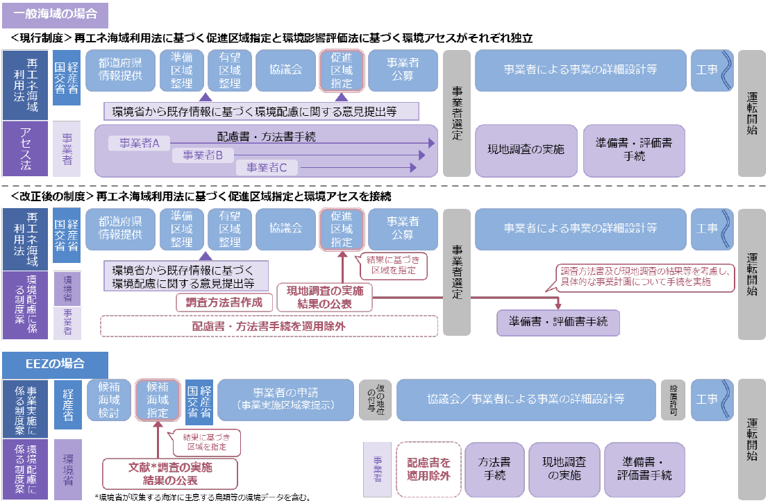 改正法は、一般海域について、促進区域指定前の段階で国主導の下に配慮書・方法書段階の手続を実施することを前提に、事業者がこれらの手続を実施することを不要とした。改正前後の具体的な流れを比較したのが下記の図4の上段と中段である(下段はEEZの場合の流れを示したものである。)。