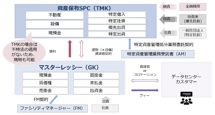 データセンターの開発・運営においてTMKストラクチャーを活用する際の主なメリットとして、TMKは不動産を現物で保有することができるため、必ずしも不動産を信託受益権化する必要がないことや、租税特別措置法上の導管性要件(同法第67条の14第1項参照)を満たす場合には利益配当の損金算入が可能となり二重課税の回避が制度上認められているため、GK-TKストラクチャーと比較して税務上の安定性が高いことなどが挙げられる。