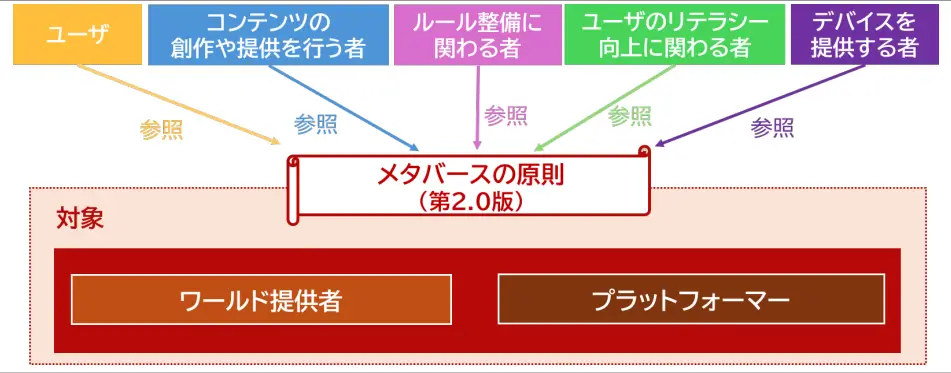 なお、改定後のメタバースの原則は、1.0版に引き続き、「ユーザ」、「コンテンツの創作や提供を行う者(クリエイターを含みます。)」、「メタバースに関するルール整備に関わる者」、「メタバースに関するユーザのリテラシー向上に関わる者」を含む全てのステークホルダーの取組においても参照されることが期待されるものですが、XRデバイスを提供するデバイスメーカー等の果たすべき役割の重要性に鑑み、「デバイスを提供する者」が含まれることが明記されており、引き続きメタバースに関係する全ての方が参照すべきものといえます。