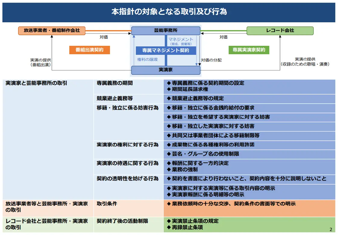 | 行動指針 | 芸能事務所が採るべき行動と問題となり得る行動の例 |