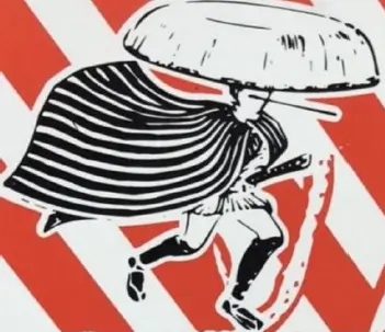 被控訴人商品は、そのラベルに、以下のように、三度笠をかぶり、縦縞の道中合羽を身に着け、口に長い棒状のもの(楊枝)をくわえ、長脇差を携えた人物が走っている姿を描いた図柄(以下「被控訴人図柄」といいます。)を付していました。被控訴人は、自社のウェブサイトにも当該商品の画像を掲載していました。なお、被控訴人のウェブサイトには、「紋次郎いかの由来」として、「昭和47年(1972年)6月25日 するめ足に串を刺した醤油味の珍味が誕生しやした。名前の由来は、その頃テレビで流行っていた木枯らし紋次郎がくわえていた長い楊枝(ようじ)を串に見立てたことによるようでござんす。」との文章を掲載していたことがありました。
