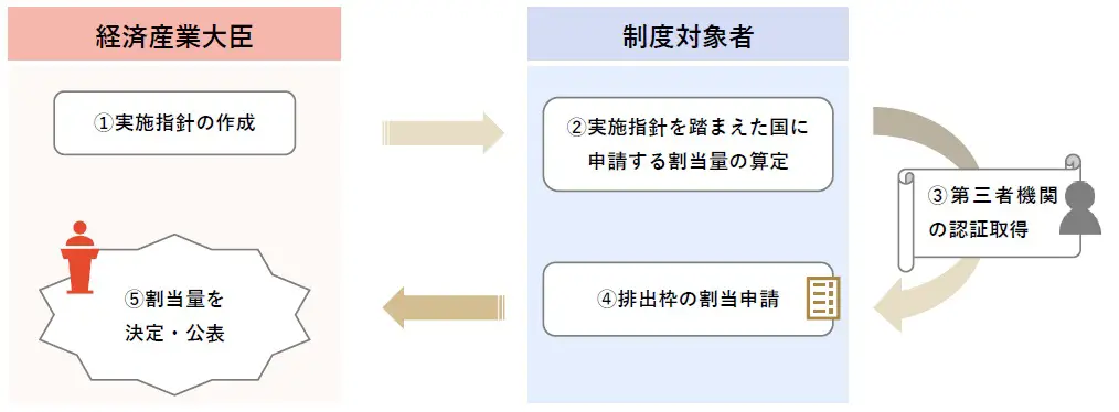 各制度対象者に対して排出枠を割り当てるのは経済産業大臣ですが※2、その割当量は、制度対象者が登録確認機関による確認を受けて届け出た排出目標量を基礎として算定されることが想定されていますので、以下の図に示されるようなプロセスを辿ることになります。