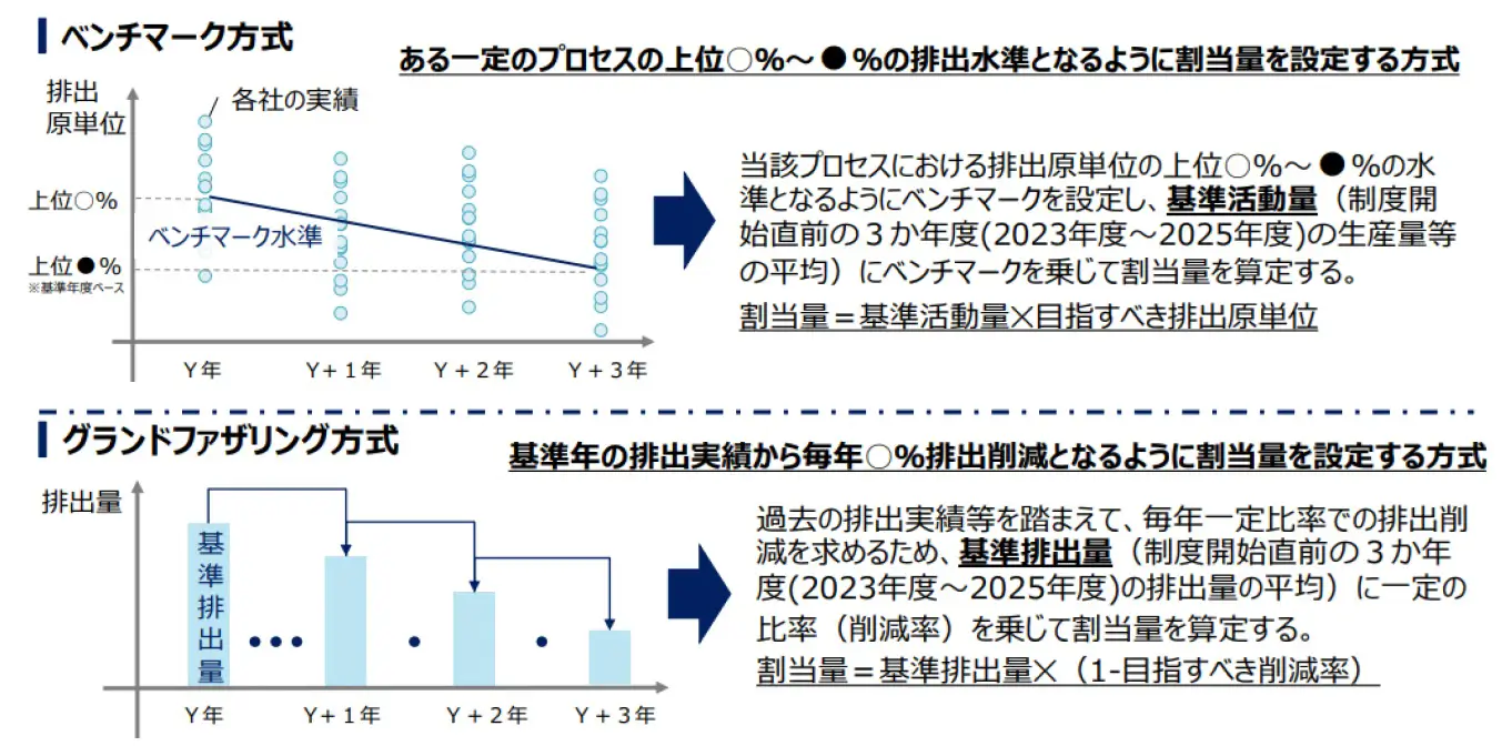① エネルギー多消費分野等については、業種別ベンチマークを定め、これに基づいて企業ごとの割当量を算定する方式(ベンチマーク方式)を採用し、ベンチマークの設定が困難な業種については、基準となる年度の排出量に一定の削減率を乗じるグランドファザリング方式が採用されます。