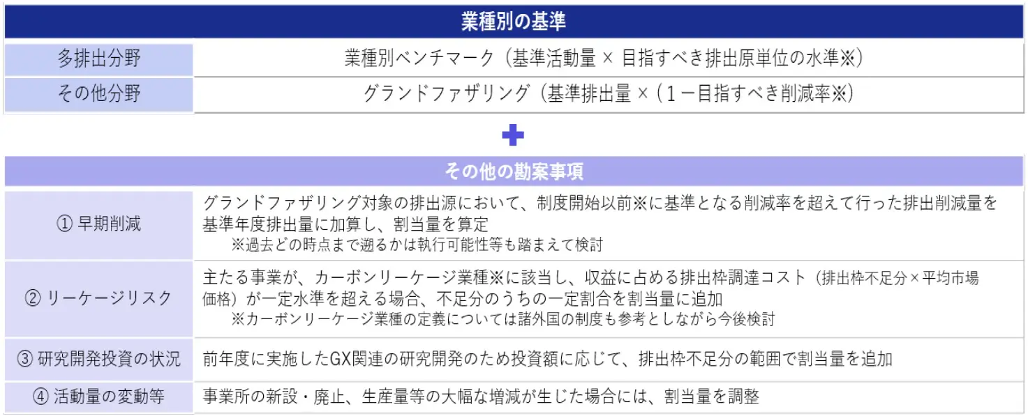 ② 但し、上述したベンチマーク方式やグランドファザリング方式を基礎としつつも、過去の削減努力や、リーケージリスク、足下で削減効果が発現しない研究開発のための投資額に応じて割当量を調整することが想定されています。