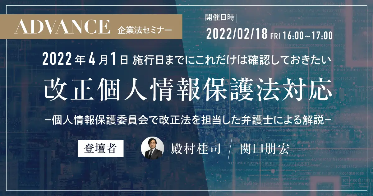 本セミナーでは、ほぼ全ての事業者にとって見直しが必要となると思われるプライバシーポリシーと、実務上注意すべき点も多い委託先との委託契約に焦点を当てて、施行直前に迫った改正法対応のために確認しておくべき実務上のポイントについて、昨年末まで個人情報保護委員会に出向して令和2年改正法や法令解釈等を担当していた関口朋宏弁護士と、個人情報・データ関連の案件を多く扱う殿村桂司弁護士がわかりやすく解説いたします。(所要時間:約62分)