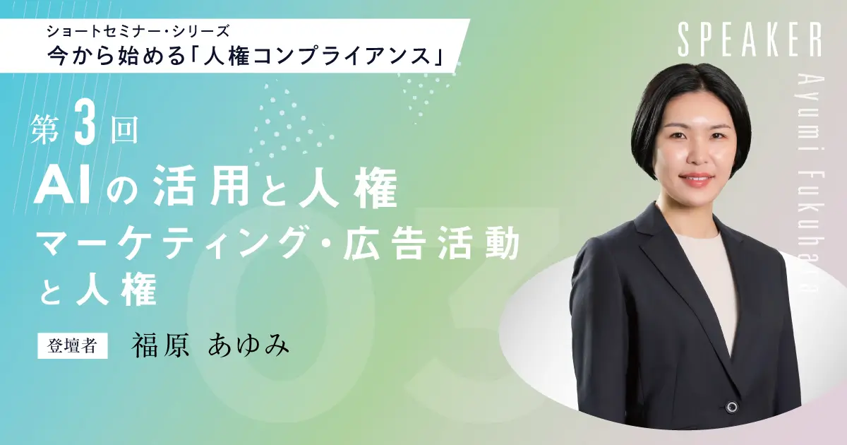 AIは需給予測や広告など様々な企業活動において利用されていますが、一方で生体認証システムによるプライバシーの侵害や、バイアスによる差別の固定化などの問題が指摘されています。また、人権意識の高まりにより、企業が行うマーケティング・広告活動においても人権尊重やダイバーシティ&インクルージョン(D&I)の視点を考慮することが求められるようになっています。そのため、本セミナーではAIの利用やマーケティング・広告活動において考慮すべき人権リスクやこれをふまえて企業に求められる対応についてご紹介します。