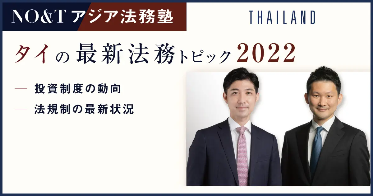 本セミナーでは、タイへの投資案件及びタイの現地法人の管理を担当されている実務担当者の方々を対象に、上記の近年のトレンドを踏まえた最新の法改正の重要トピックを厳選し、投資制度の動向と法規制の最新状況について現地に駐在する日本人弁護士が解説します。(所要時間:約68分)