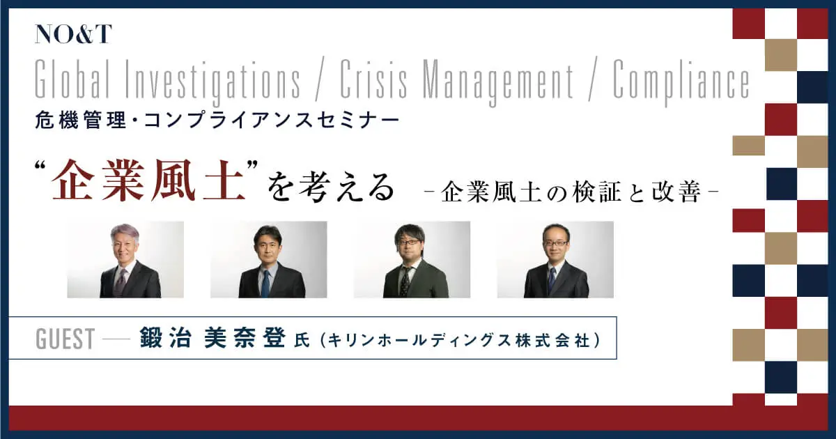 第三者委員会の報告書においては、「ものが言えない企業風土」のような形で「企業風土」という言葉をよく見かけるものの、その内容は必ずしも明らかではありません。企業のガバナンスやコンプライアンスの実効性を確保するためには、形式だけを整えるのではなく、企業の役職員の意思決定プロセスや行動様式(やそれに影響を与える各種のシグナル)に目を向ける必要があり、そのような観点からあらためて企業風土を考えることが求められます。本セミナーにおいては、このような問題意識を前提に、企業風土とは何かについて議論を深めるとともに、異なる立場で様々な企業を見てきた弁護士が「企業風土」についてパネルディスカッション形式で意見交換を行います。(所要時間:約65分)