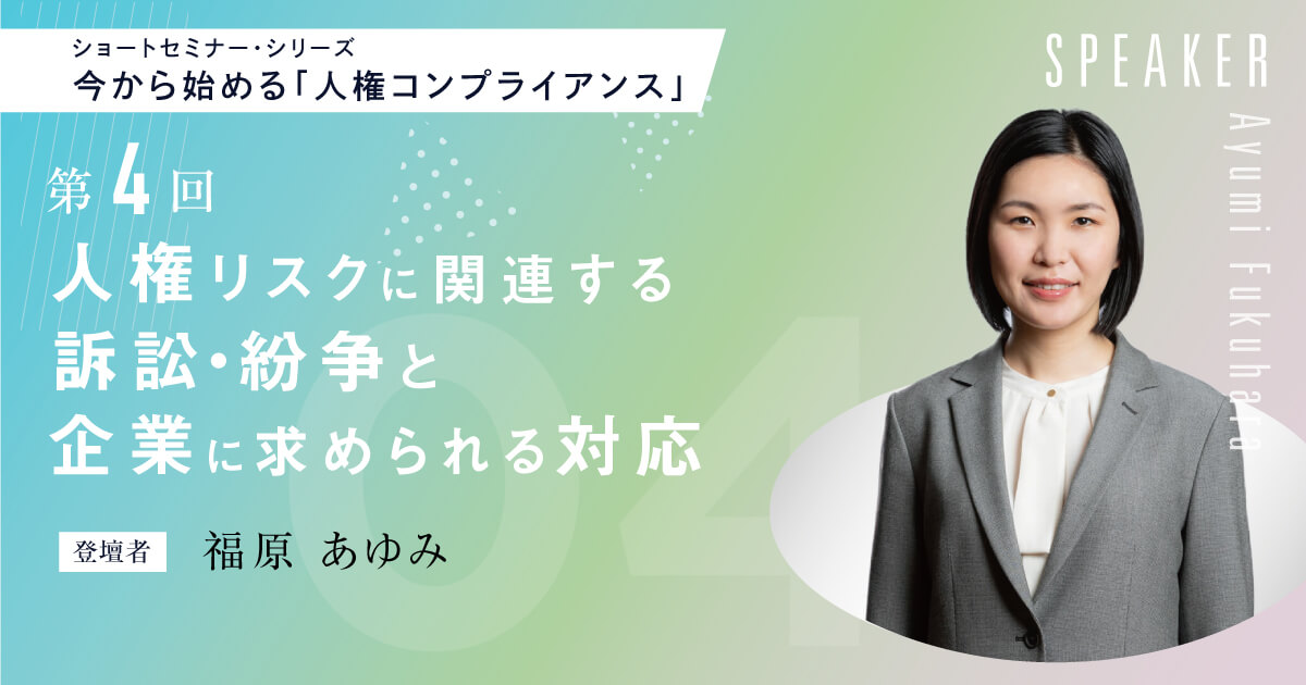 人権リスクの顕在化は、企業に対し、不買運動などのレピュテーションリスクや、投資からの撤退(ダイベストメント)など様々な形態で生じるところ、訴訟リスクとして顕在化した場合には、企業にとって長期的に多大な費用やリソースの負担を生じさせる可能性があります。本セミナーは、そうした観点から、人権リスクに関する近時の訴訟や紛争の事例を類型ごとにご紹介するとともに、こうした事案をふまえて企業に求められる事前・事後の対応について併せてご紹介します。(所要時間:約28分)