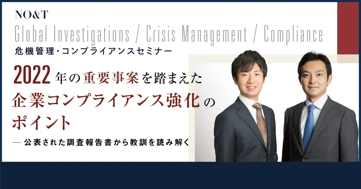 2022年も多くの企業不祥事・企業不正が公表されており、コンプライアンス強化のための取組みは、本年も企業の重点課題の一つに位置づけられることとなりそうです。そこで、本セミナーでは、2022年を含め、近時公表された企業不祥事事案の調査報告書の内容を複数検討し、コンプライアンス問題の最新動向を踏まえながら、多くの企業に共通して妥当すると考えられるコンプライアンス強化のための重要な教訓・視座(具体的なトピックとしては、①平時のリスク管理の取組み、②モノ言える職場環境の整備、及び③二次的不祥事回避の視点)について、コンプライアンス問題を多く取り扱う弁護士によるディスカッション形式で整理・解説いたします。(所要時間:約60分)