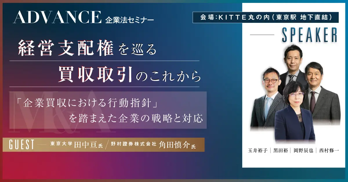 「同意なき買収」が起こりにくいと言われてきた我が国において、近時、対象会社の同意なく買収を行う、いわゆる「同意なき買収」の提案が増加傾向にあります。今後の企業の経営支配権を巡る買収取引において、取引に関わる当事者が採るべき戦略や対応はどうなっていくでしょうか。指針の内容やWGの検討状況を紹介するとともに、指針策定に向けた議論を行った「公正な買収の在り方に関する研究会」の委員も交え、大きな節目にある我が国のM&A市場における様々な課題について討議いたします。