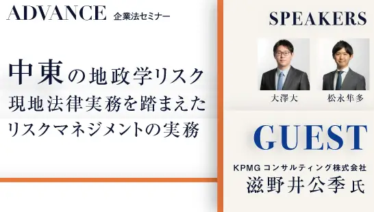 本セミナーでは、中東地域の緊迫情勢を踏まえて、中東の地政学リスクに精通したコンサルタントをゲストとしてお招きし、経済安全保障・地政学リスクにかかる対応策に関して経験豊富な大澤大弁護士と中東における現地法律実務の経験を有する松永隼多弁護士が、地政学リスクや現地法律実務を把握すべき法的必要性について説明の上、中東地域全体の地政学リスクについて概観の上、UAEやサウジアラビア、イスラエル、イランの各国における地政学リスクと現地法律実務を踏まえたリスクマネジメントの実務について解説します。(所要時間:約75分)