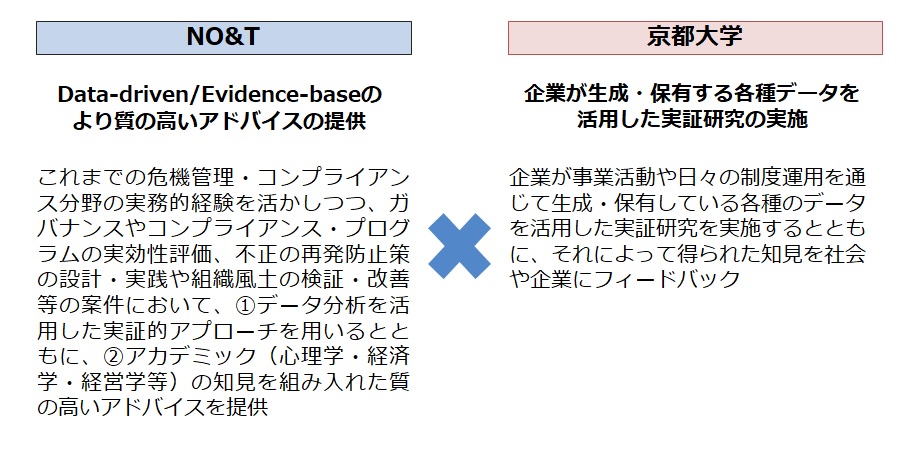 この連携協定は、京都大学大学院法学研究科附属法政策共同研究センターの有する多様な学術的知見とNO&Tが有する実務的知見を統合することで、京都大学における実証的な学術研究の振興と、NO&Tにおける質の高いリーガルサービスの提供に、それぞれ資することを目的とします。