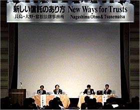 当事務所は、初の試みとして、2001年2月19日(月曜日)午前10時半から午後5時半まで、サンケイプラザにおいて公開シンポジウム「新しい信託のあり方―商事信託、証券投資信託、J-REIT―」を開催いたしました。米国の信託法分野での権威ジョン・ラングバイン教授、タマル・フランケル教授、東京大学の樋口範雄教授、神田秀樹教授、藤田友敬助教授、当事務所の井上聡弁護士、田中俊平弁護士を含む第一線の実務家が講師、パネリストを務め、水準、内容、参加人員(約350名―申し込みは500名超)において成功を収めることができました。