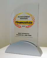 FinanceAsia主催のAchievement Awards 2007の授賞式が六本木アカデミーヒルズで開催され、当事務所はJapan House AwardsにおいてBest Domestic Financial Law Firmを受賞しました。
