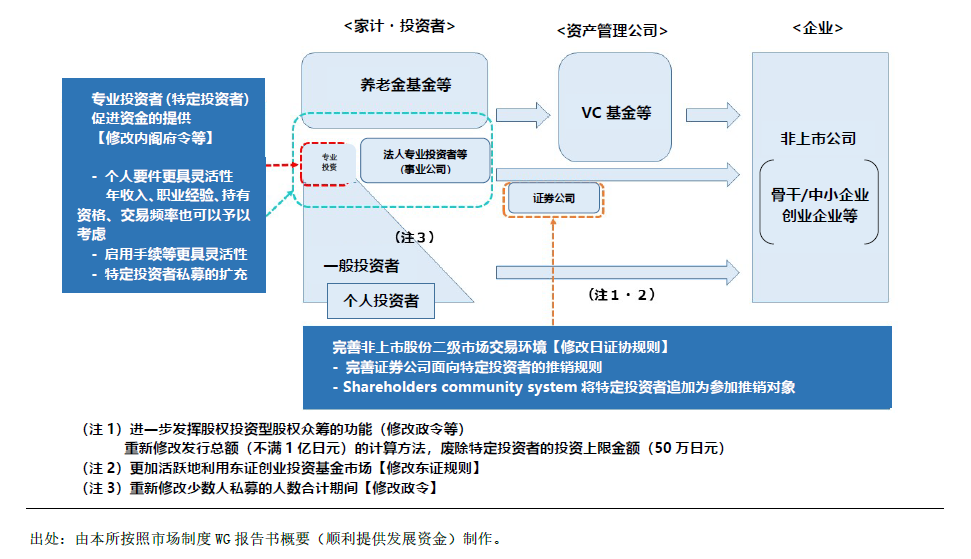 作为提供非上市公司发展所需的资本性资金的主体,能否扩大投资者的范围,发展成一项能够使发展资金容易流入非上市公司的制度,这也是一个重要问题。有鉴于此,2021年6月公布的金融审议会市场制度工作组第二次报告书提到了以下修改措施※12。
