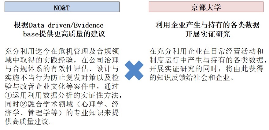 本合作协议旨在融合京都大学大学院法学研究科附属法政策共同研究中心拥有的多样化学术知识与NO&T的实践经验,以此促进京都大学的实证性学术研究,同时提升NO&T提供高质量法律服务的能力。